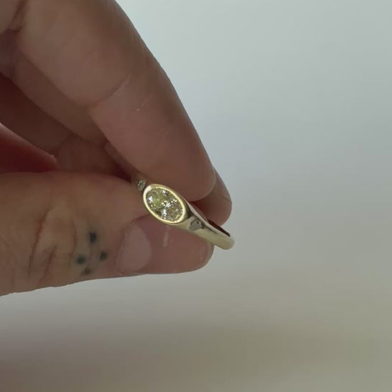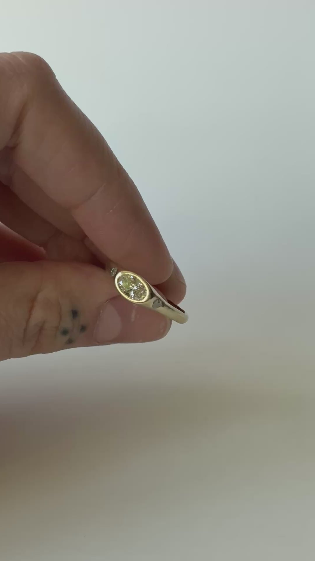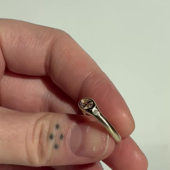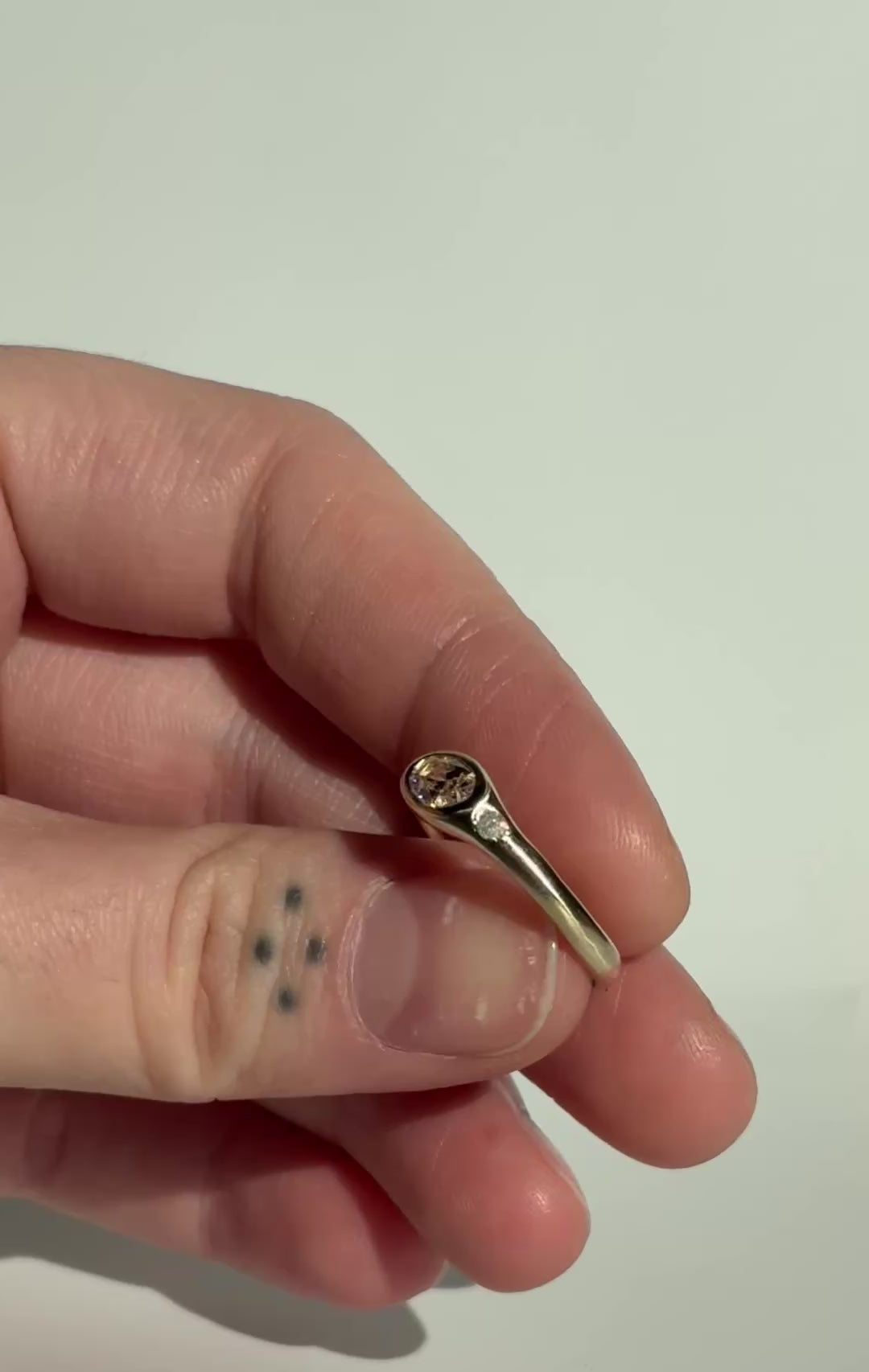 Darling is solid 10k gold with a satin finish, holds a half carat lab diamond and two natural milky diamonds!