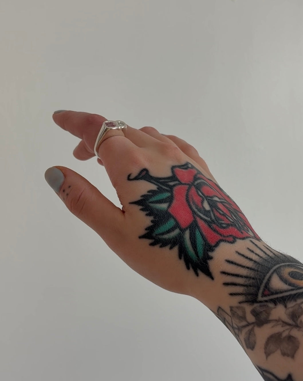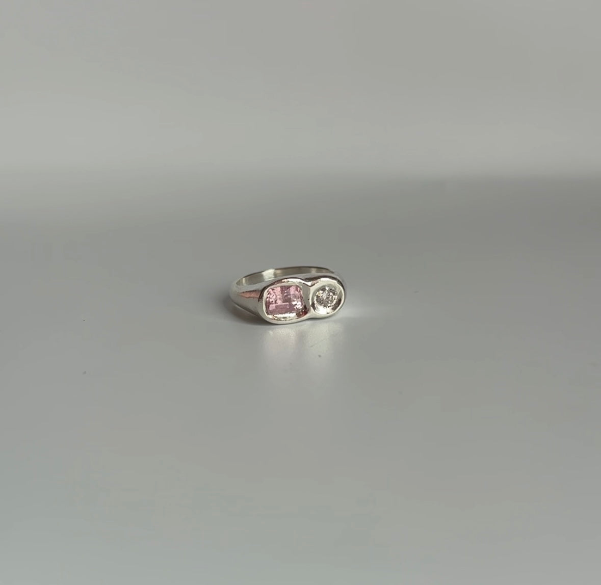 Sterling Silver with a cherry blossom pink tourmaline and a brilliant cut moissanite, she really is the color palate for spring in Philly! Size 7.5