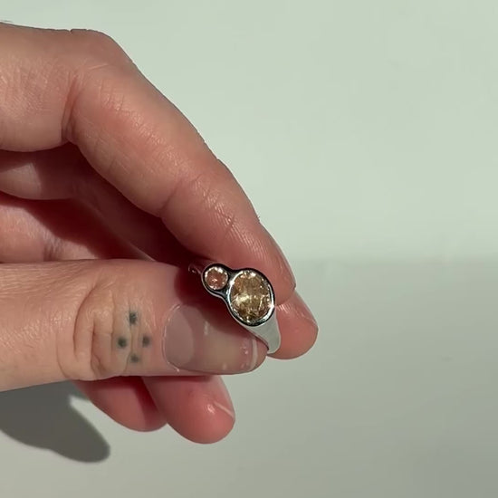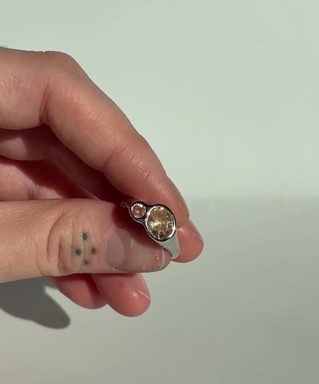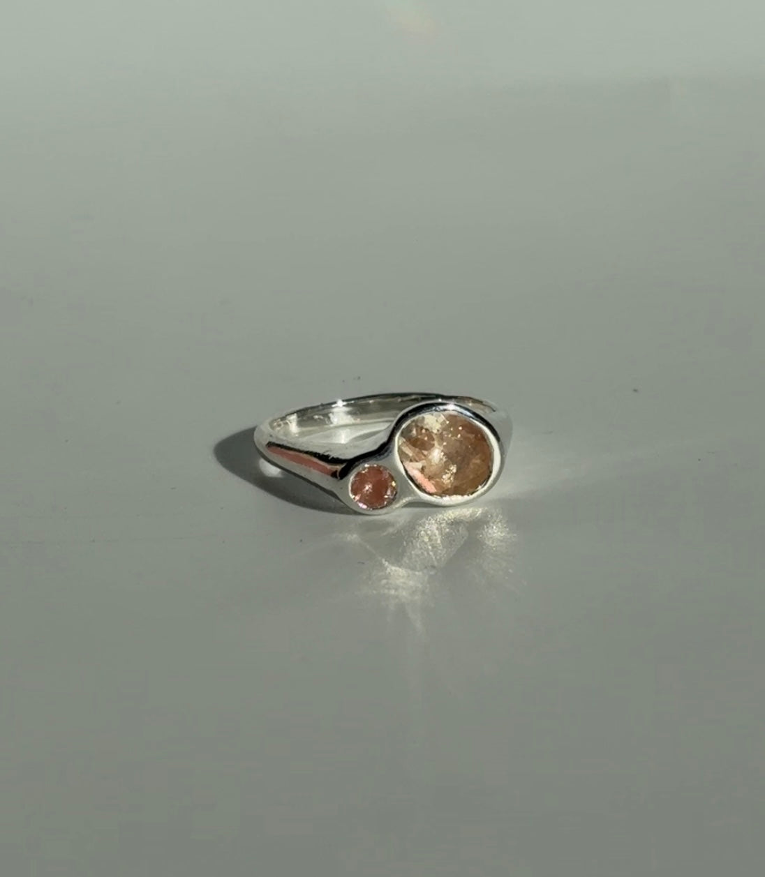 Solid sterling silver with two gorgeous oregon sunstones, they have a stunning color shift and are truly one of a kind! ☀️ size 7